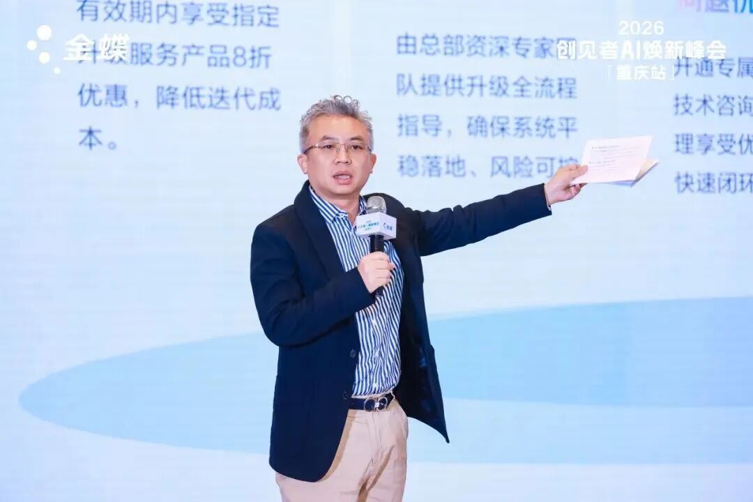 会上,金蝶正式发布 “AI焕新同行者计划”,以全周期、全场景的专属服务体系,为企业AI转型保驾护航,助力企业从数字化工具应用迈向价值深度落地。金蝶中国助理总裁、重庆分公司总经理张颖详解了计划的六大核心权益: