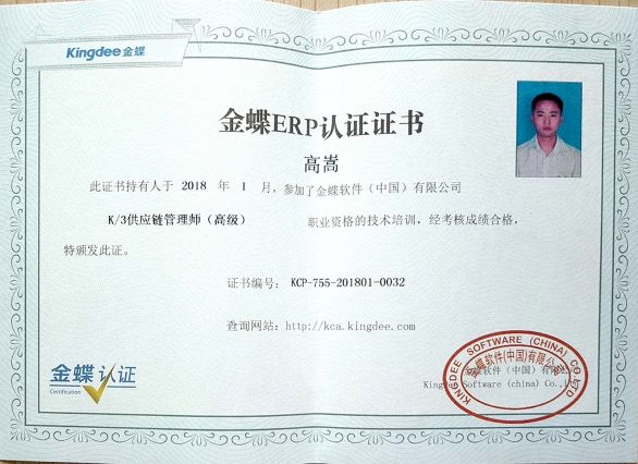 金蝶ERP认证证书K3供应链管理师-高嵩(高级)
