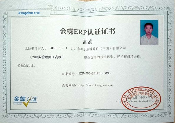 金蝶ERP认证证书K3财务管理师-高嵩(高级)