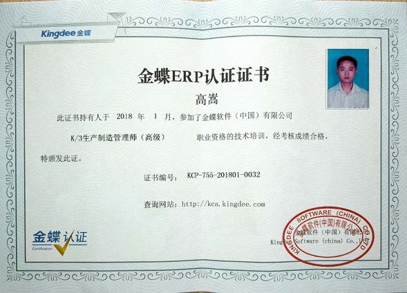 金蝶ERP认证证书K3生产制造管理师-高嵩(高级)