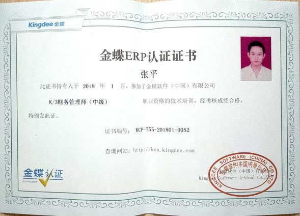 金蝶ERP认证证书K3财务管理师-张平(中级)