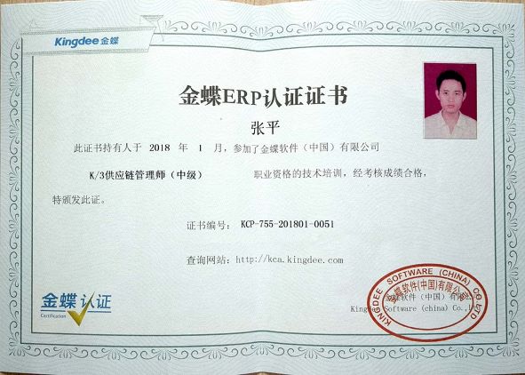 金蝶ERP认证证书K3供应链管理师-张平(中级)