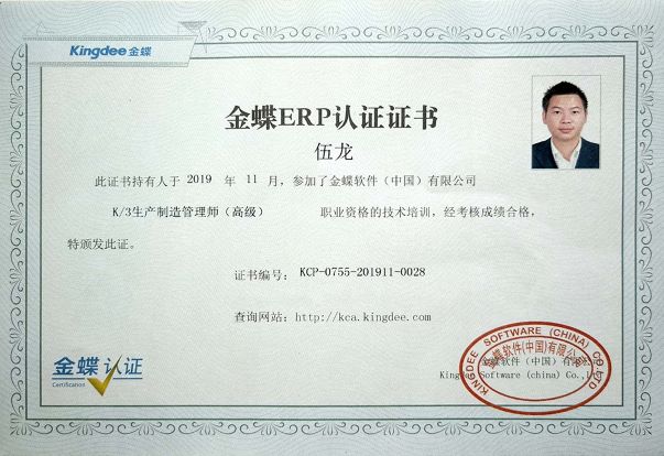金蝶ERP认证证书K3生产制造管理师-伍龙(高级)