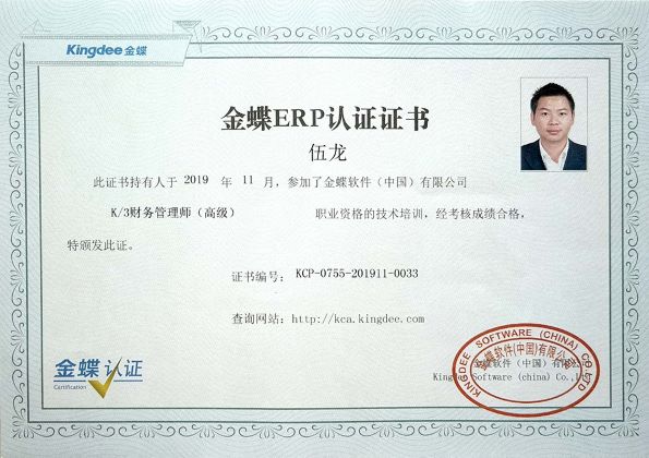 金蝶ERP认证证书K3财务管理师-伍龙(高级)