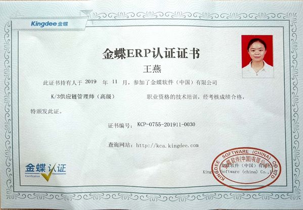 金蝶ERP认证证书K3供应链管理师-王燕(高级)