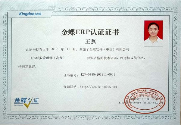 金蝶ERP认证证书K3财务管理师-王燕(高级)