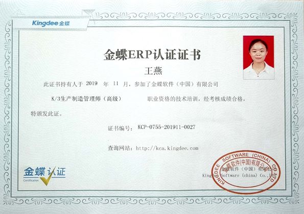 金蝶ERP认证证书K3生产制造管理师-王燕(高级)