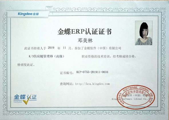 金蝶ERP认证证书K3供应链管理师-邓美林(高级)