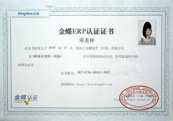 金蝶ERP认证证书K3财务管理师-邓美林(高级)