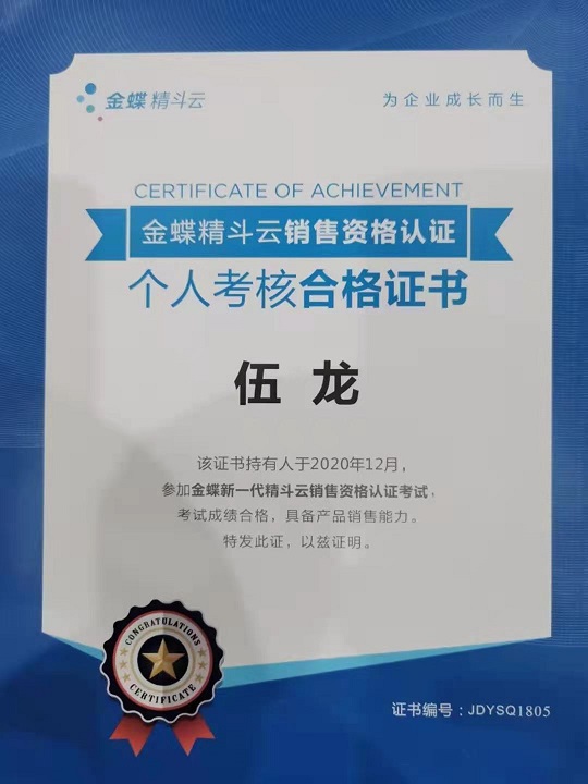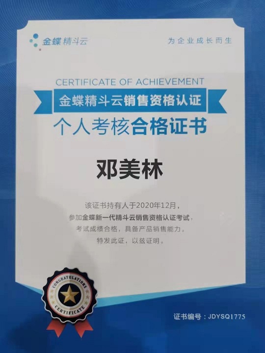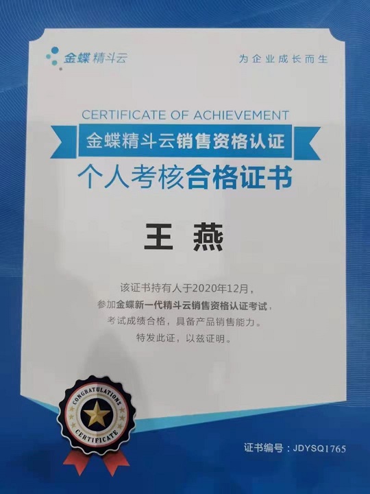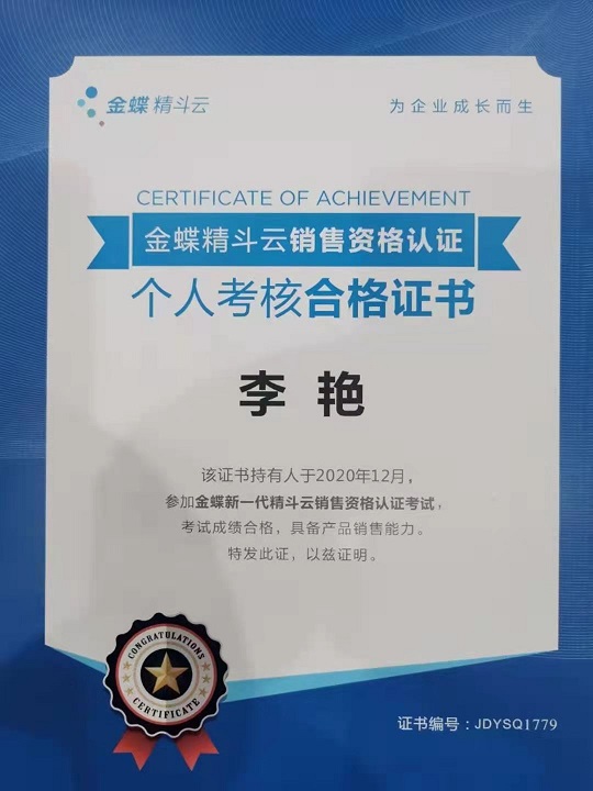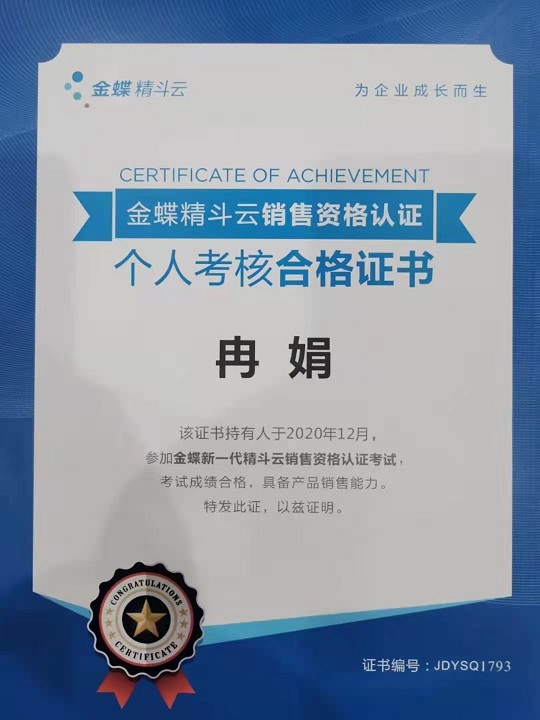 杜树娟参加金蝶云星空旗舰版初级考核考试合格