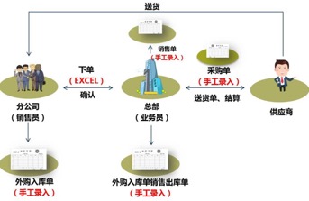 全国各地的分公司每天与深圳阪田总部下单采购,日单量在50单左右。深圳阪田的业务员接到销售公司EXCEL形式的采购订单,经过与销售员确认后,在自己的系统中录入各分公司的销售订单,再下推为采购订单,下达给供应商,供应商接到深圳阪田总部下的采购订单后,根据订单送货给各分公司,并将送货单通知深圳阪田总部,深圳阪田总部录入外购入库单和销售出库单,同时各分公司在自己的系统内录入外购入库单。后续供应商与深圳阪田总部结算。